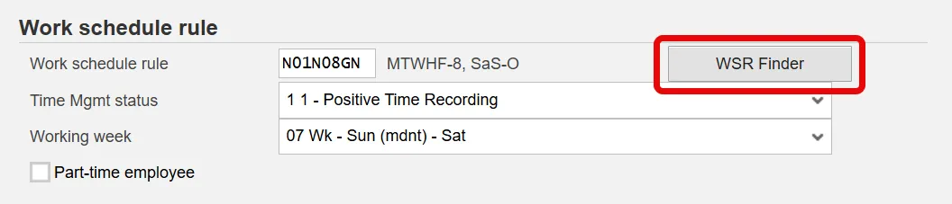 The purpose of this job aid is to explain the Work Schedule Rule finder search tool to find work schedules on IT0007 via the WSR Finder button.