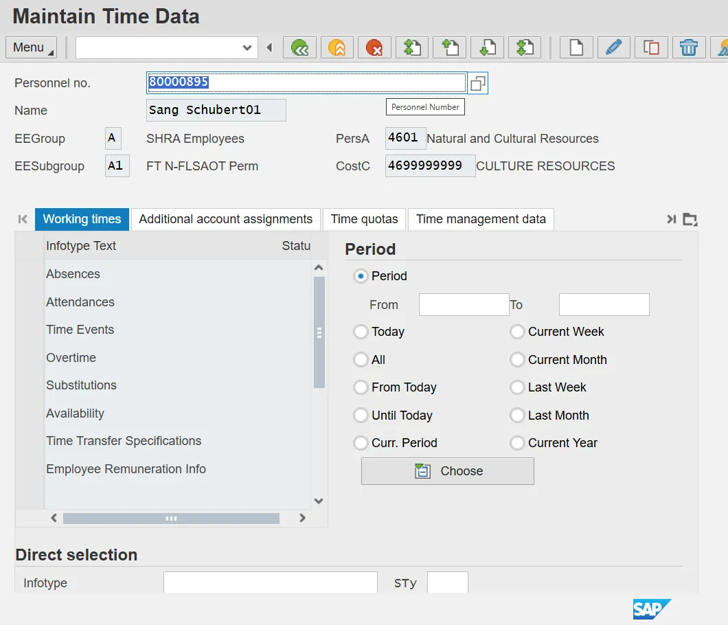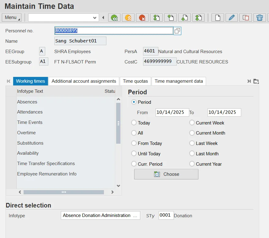 Step 2. Enter the donor employee’s personnel number in Personnel no. field and click Enter on your keyboard. Example: 80000895