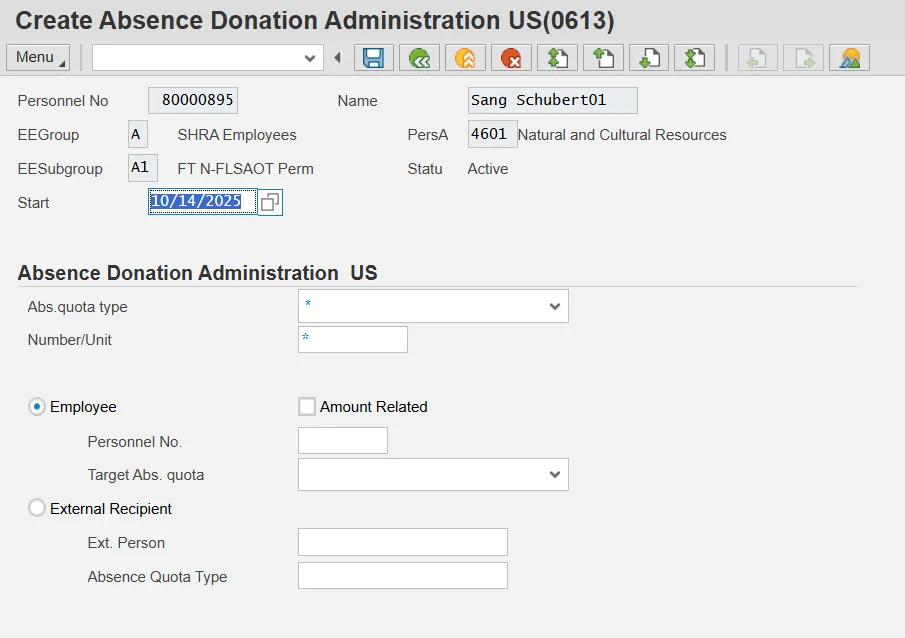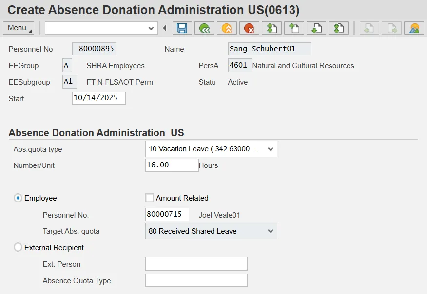 CRITICAL: In order for a leave donation to be processed correctly, the receiving employee must have a current Absence Pool record (Infotype 696). These steps are detailed in the TM-52 Received Shared Leave (Recipient) BPP. Verify that the IT696 eligibility record exists for the recipient employee before continuing.