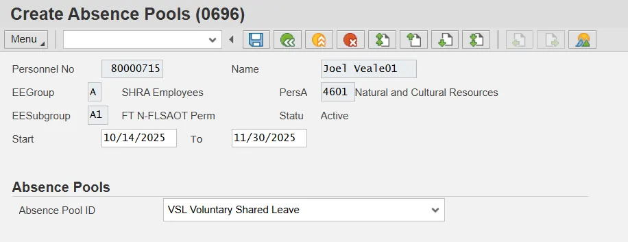 Once an employee is approved for Voluntary Shared Leave, you will create an eligibility record that enables the employee to receive leave donations using Infotype 696 (IT0696) The Absence Pool. Even though the infotype name references absence pools, the functionality in the Integrated HR-Payroll System (based on OSHR Voluntary Shared Leave policy) will allow only direct employee-to-employee leave donations. There is a single subtype of IT0696 that is relevant to Received Shared Leave eligibility: Foreign Pool (Subtype F). The Foreign Pool subtype creates a generic eligibility record for the employee.