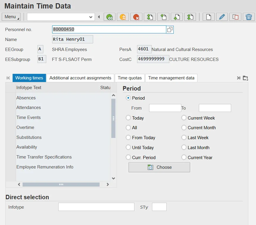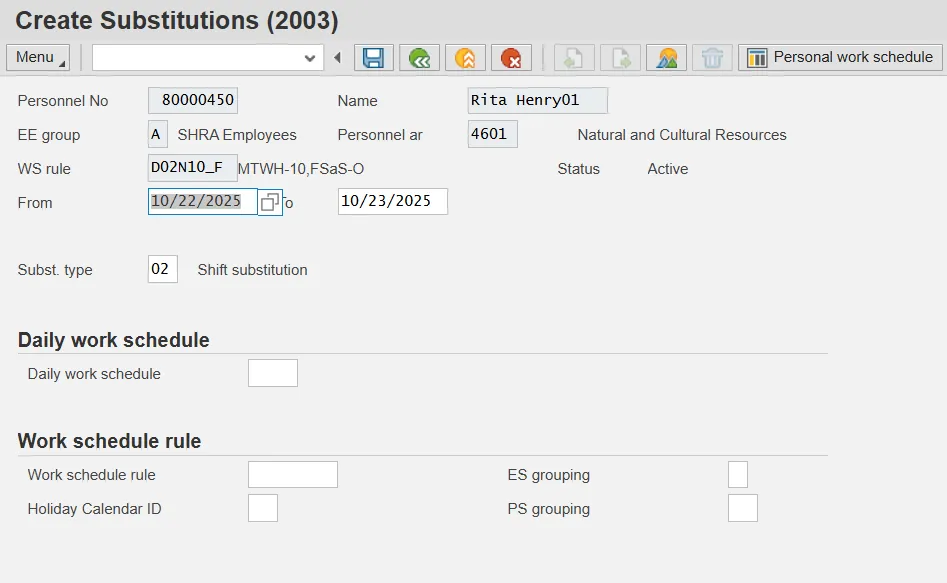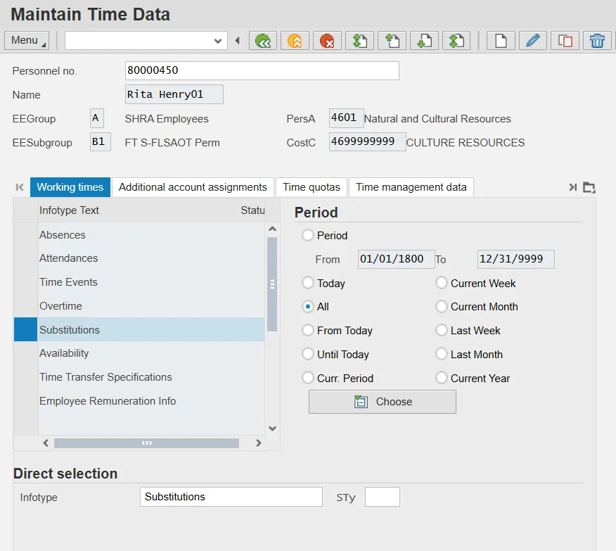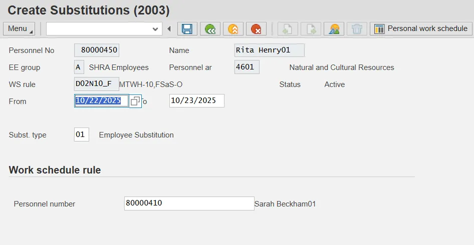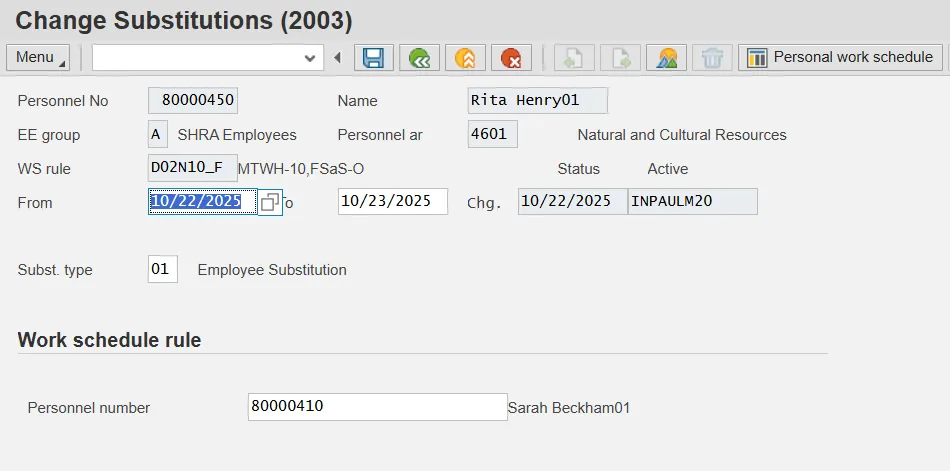 Employee substitution (subtype 01) - An employee substitution involves specifying a personnel number of the employee for which the substituting employee will be replacing during the period of the substitution record. The substituting employee will assume the planned working time and premium eligibility of the employee specified for period of the substitution record.