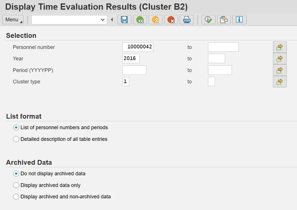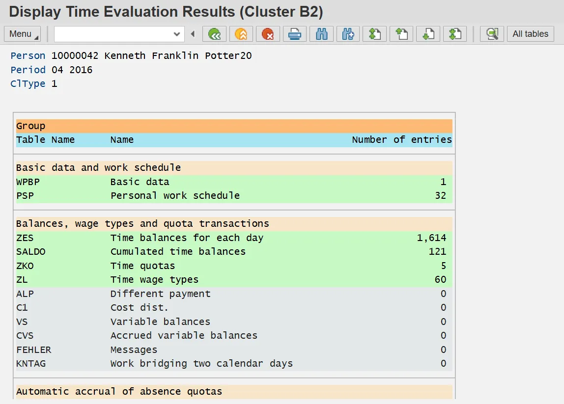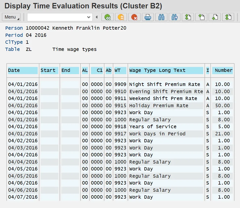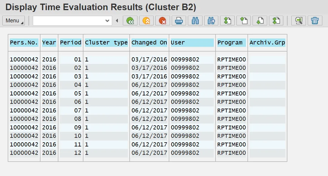 Time Evaluation results are stored for every employee on a monthly basis regardless of the employee's Payroll Area. Each month is referred to as a Time Evaluation period. January is period "1," February is period "2," and so on. The stored results include Wage Types, Quota Accruals, Attendances, Absences, Current Actions, Time Evaluations messages and Substitutions.