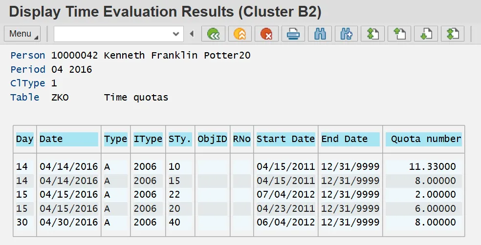 Step 9. Double click ZKO in the Balances, wage types and quota transactions group. The ZKO table lists the employee's quota accruals for the selected period. The Day column displays the day of the period on which the quota was accrued. The Sty. column displays the quota number of the quota accrued. The Quota number column displays the amount of the accrual. These rows of data indicate that the example employee, Kenneth Potter, earned 11.33 hours of vacation leave and 8 hours of sick leave on 4/14/2016.