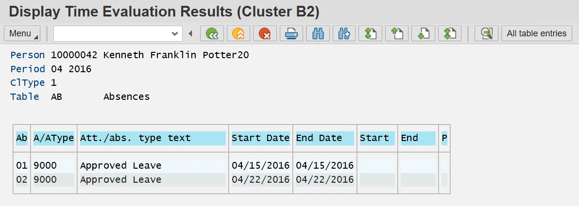 Step 15. Double click AB in the Time data group. The AB table lists the absences an employee reported for selected period as well as the dates of the absences. The Ab column displays the sequential number of the absence for the period. The A/AType column displays the absence code reported on the time sheet. The Start Date and End Date columns represent the duration of the absence. The example employee, Kenneth Potter, had 2 absences in April 2016. Both were for Approved Leave on 4/15 and 4/22.