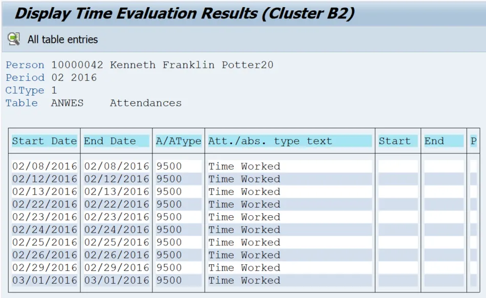 Step 17. Double click ANWES in the Time data group. The ANWES table lists attendances reported for the employee during the selected period. The Start Date and End Date columns represent the duration of the attendance. The A/AType column displays the attendance code reported on the timesheet. Double click on a date on the ANWES table to obtain more detailed information on a particular attendance, such as the hours reported.