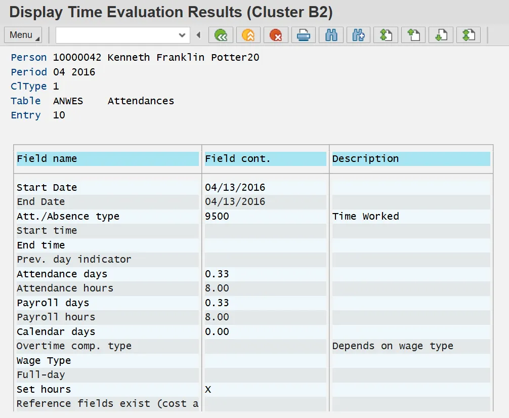 All employee time data is processed in Time Evaluation. The results of this processing are stored in the Integrated HR-Payroll System using structures known as clusters, specifically the B2 cluster. B2 clusters are both viewable and reportable using transaction PT66. Transaction PT66 can be used to troubleshoot Payroll and Time related inquiries.