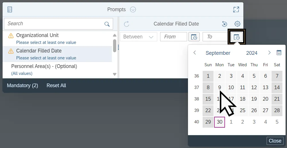The Calendar Filled Date selects a date range to compile data for the generated report. Follow the steps below to complete the Calendar Filled Date prompt. There are 3 steps to complete this process.