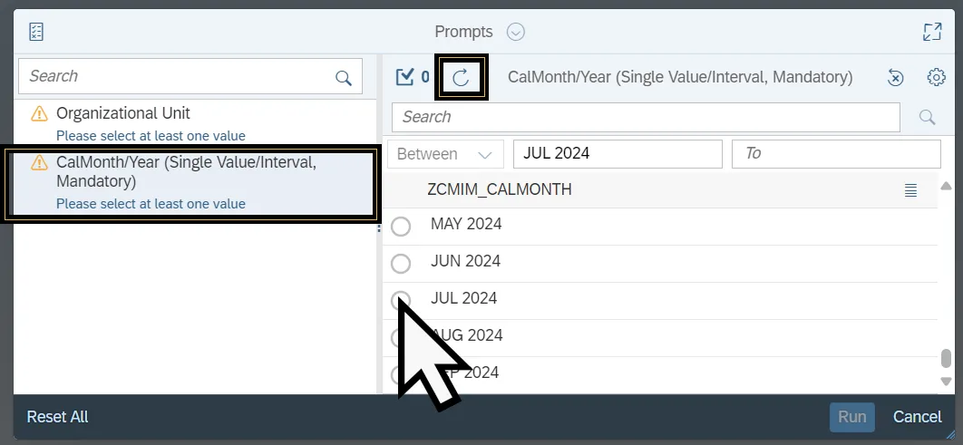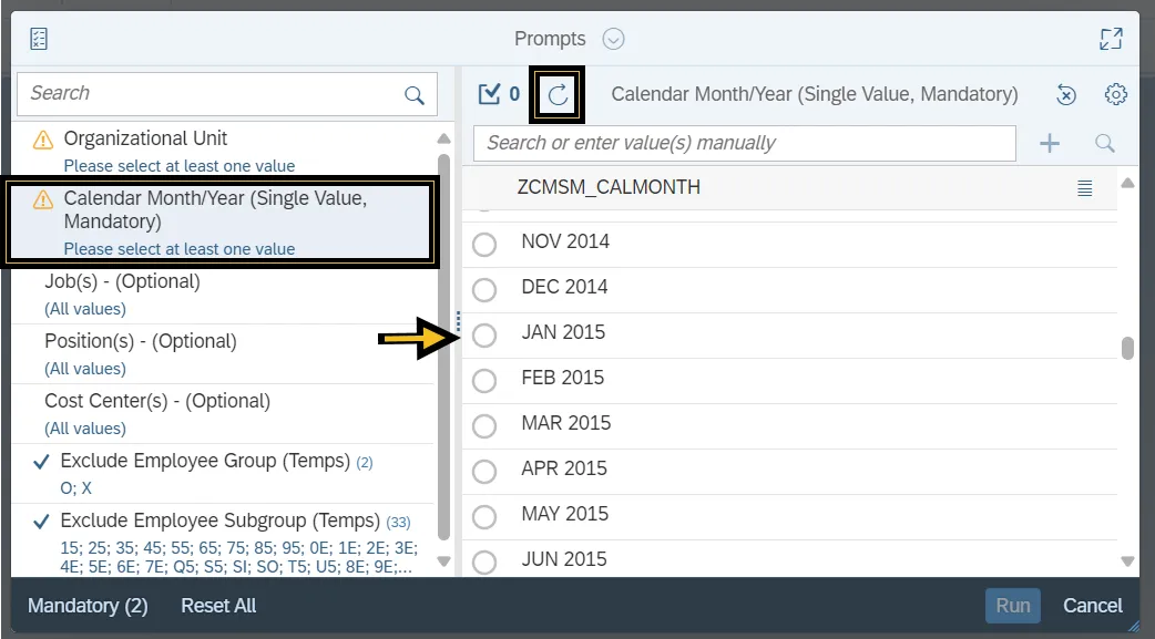 Step 2. Click the Refresh Values icon to see the list of months and years. Alternatively, use the Search field to enter the desired Month and Year combination. Values for the Calendar Month/Year are displayed as the first three letters of the month and then the year, for example JAN 2015. Values are listed as radio buttons.