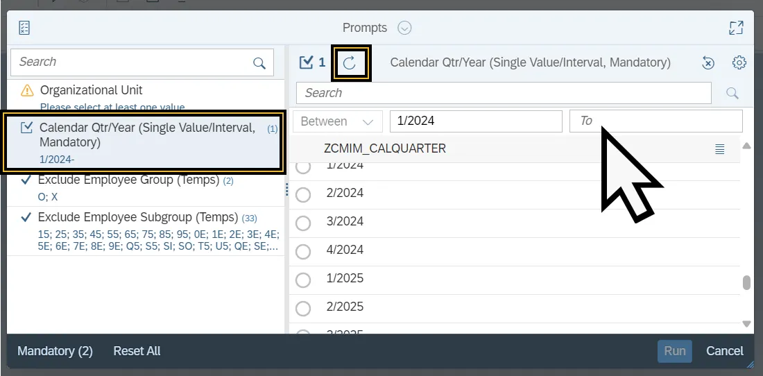 Step 1. Select the Calendar Qtr/Year (Single Value/Interval) prompt.