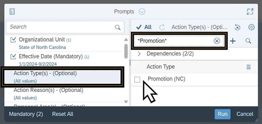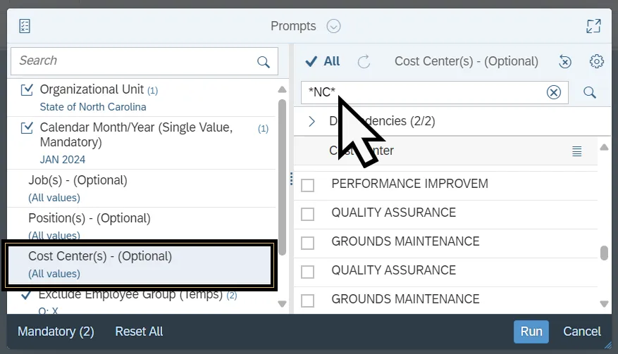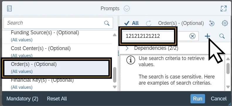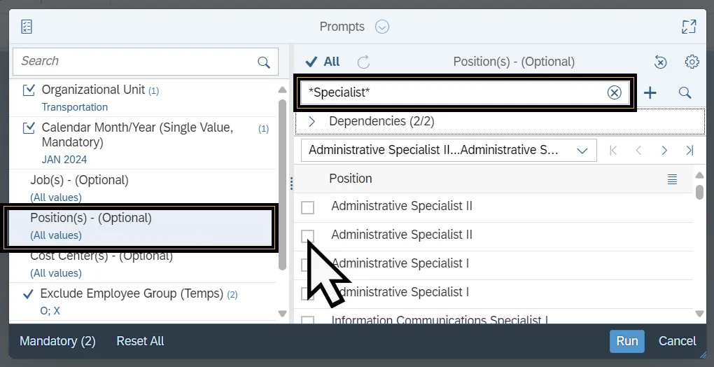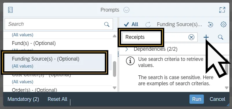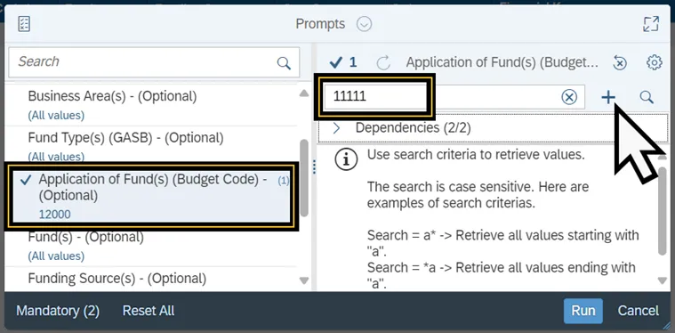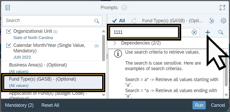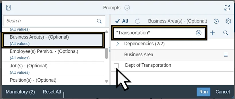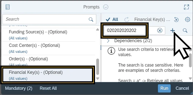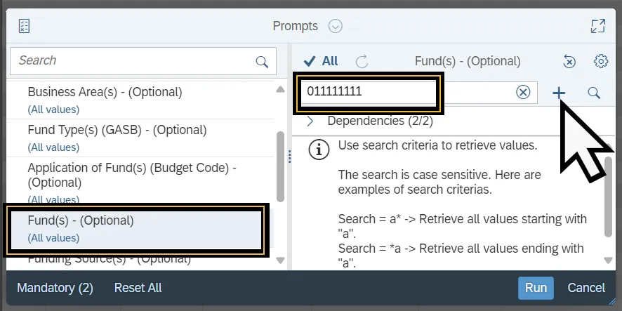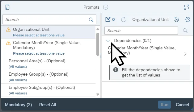 Some reports require prompts to be completed in a specific order, these reports have dependencies. If a report has dependencies, they are noted on the initial prompt summary screen under the search field. Clicking the Expand icon next to the word Dependencies will display the prompt that must be completed first. Once the dependent prompt is identified, it can then be completed to allow for additional prompts to be completed. When the dependent prompt has been filled select the other mandatory prompts from the left side panel.