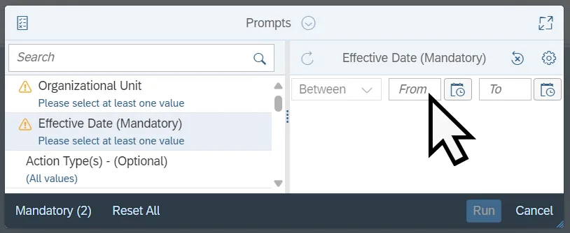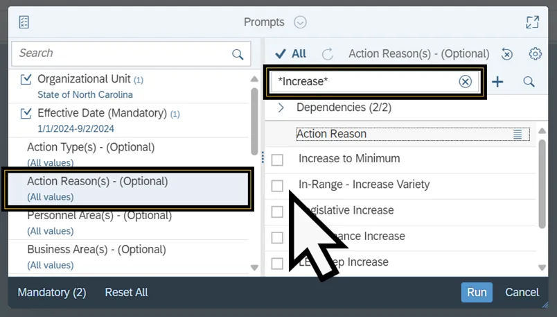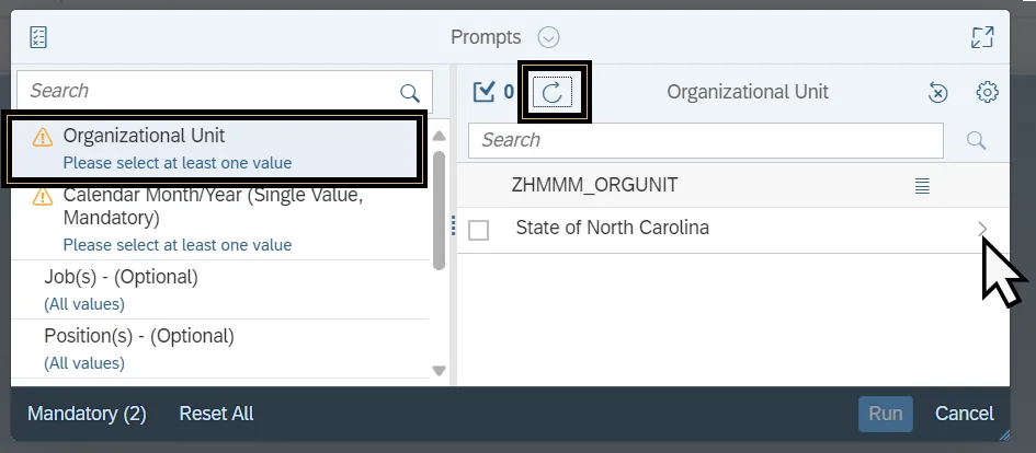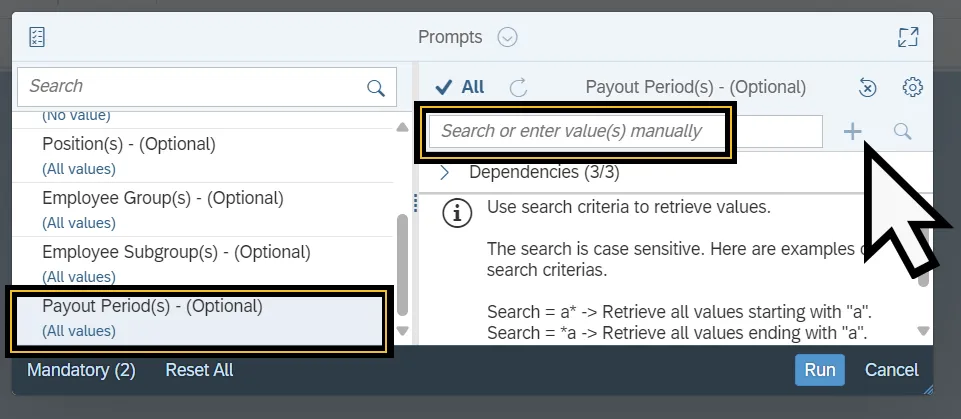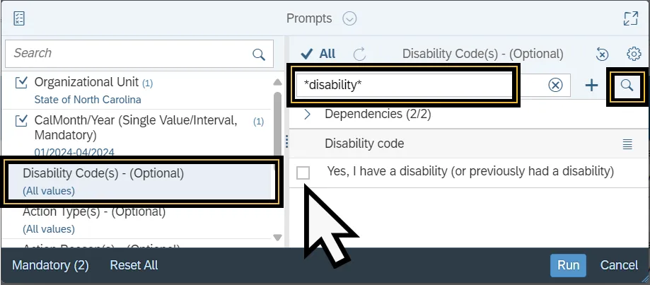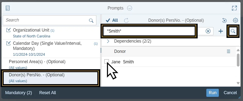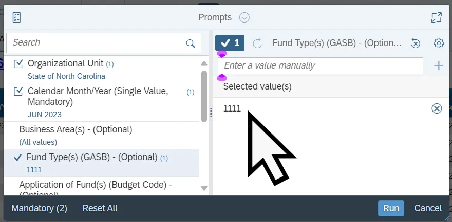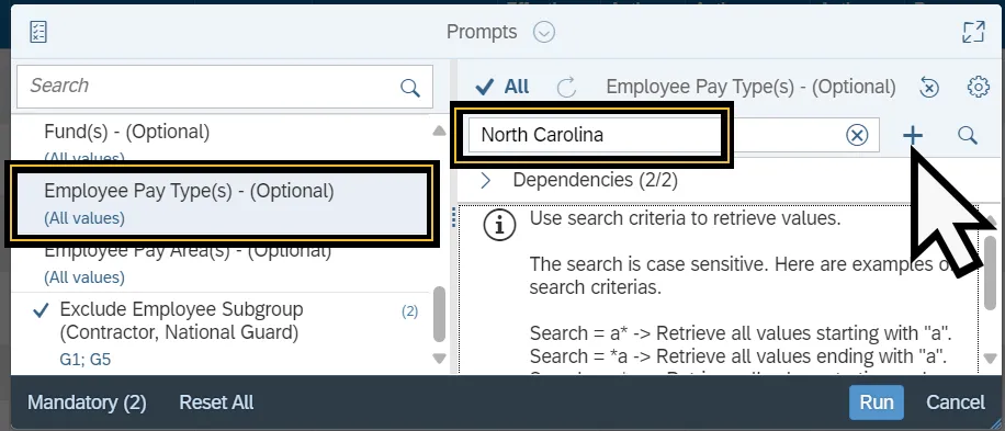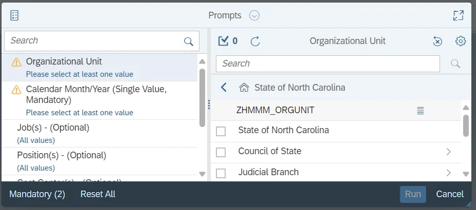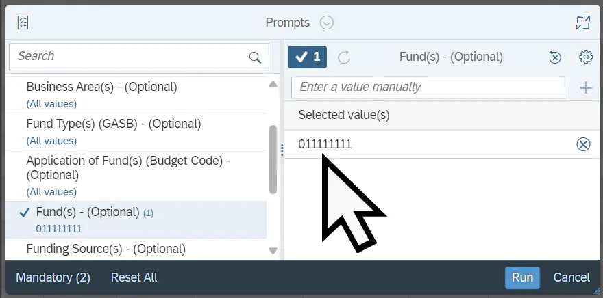 Some reports require prompts to be completed in a specific order, these reports have dependencies. If a report has dependencies, they are noted on the initial prompt summary screen under the search field. Clicking the Expand icon next to the word Dependencies will display the prompt that must be completed first. Once the dependent prompt is identified, it can then be completed to allow for additional prompts to be completed. When the dependent prompt has been filled select the other mandatory prompts from the left side panel.