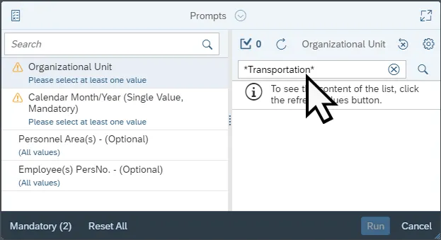 Step 2. Use the Search field to enter the desired Personnel Area(s). Wildcards (*) can be used to search for values. Alternatively, use the settings to toggle the Search by Keys on and enter the Personnel Area(s) number into the search field.