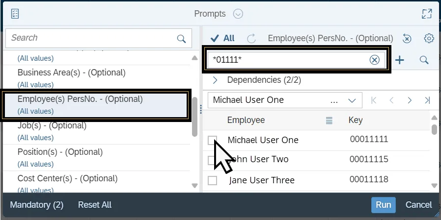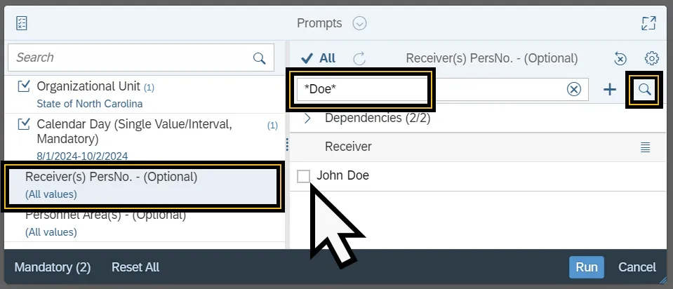 The Receiver(s) PersNo. prompt narrows the generated report to include only data that is equal to the receivers selected in the prompt. Follow the steps below to complete the Receiver(s) PersNo. prompt. There are 4 steps to complete this process.