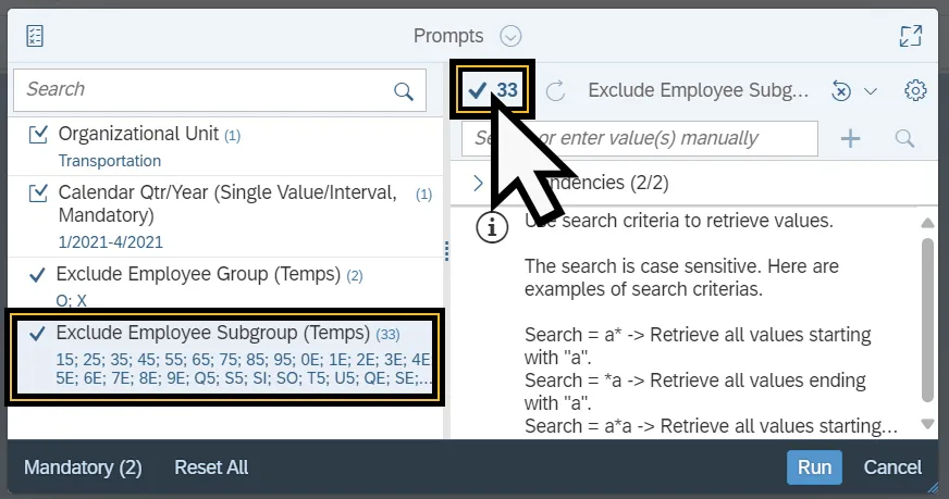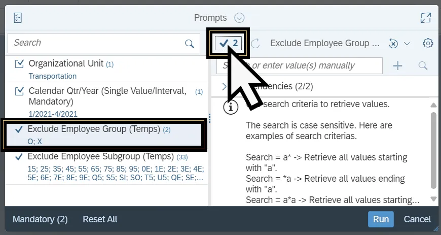 The Supv Employee(s) prompt narrows the generated report to only include information that has the Supervisor listed in the selected values. Follow the steps below to complete the Supv Employee(s) PersNo. prompt. There are 4 steps to complete this process.