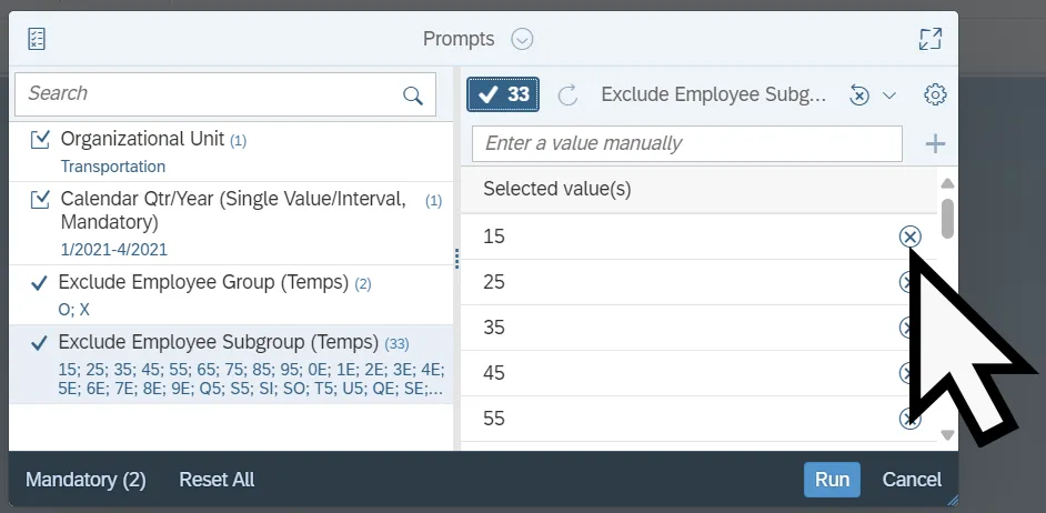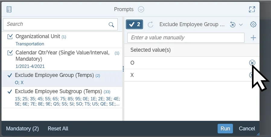 Every Web Intelligence (WEBI) report within the Business Objects repository has a unique set of prompts. These prompts determine the information that will be retrieved for the report generation. Each report will have a combination of different prompts. Every report will have mandatory prompts. These prompts must have values selected for the report to generate. Reports may also have optional and or exclusion prompts. Optional prompts can be used to narrow down the data that is complied in the report. Exclusion prompts are used to remove any data that falls within a specific criterion, resulting in the data being removed from the complied report. Exclusion prompts are predefined with some initial values for example contractors and National Guard. Exclusion prompts act as a sort filter and can be removed on the prompt summary to include previously excluded values. Both optional and exclusion prompts are used to create more efficient and effective reports. Each type of prompt has an indication labeling it as a mandatory, optional, or exclusion prompt.