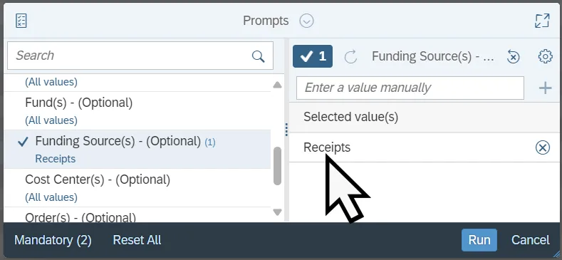 The Application of Funding Source(s) prompt narrows the generated report to include only Funding sources listed in the selected values. Follow the steps below to complete the Funding Source(s) prompt. There are 4 steps to complete this process.