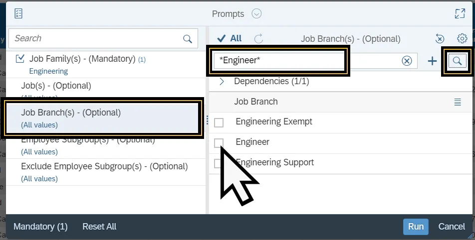 The Job Family(s) prompt selects the Job Family to compile the report data. Follow the steps below to complete the Job Family prompt. There are 3 steps to complete this process.