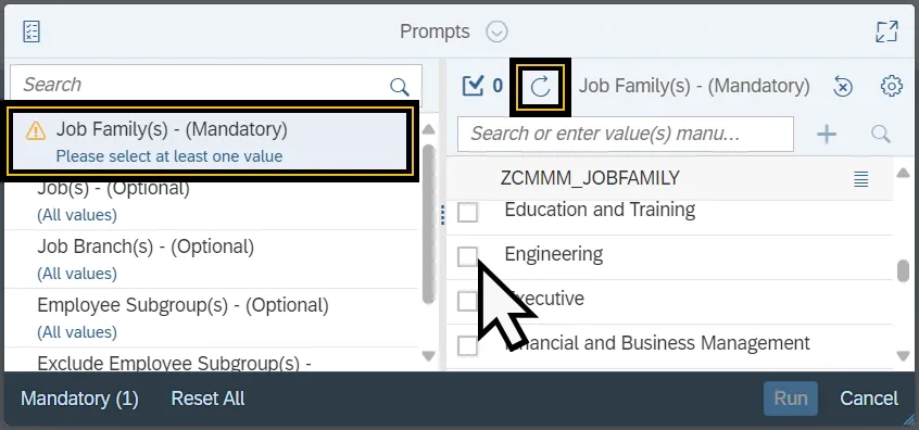Step 2. Click the Refresh Values icon to see the list of Job Families. Alternatively, use the Search field to enter the desired Job Family, then select the search icon.