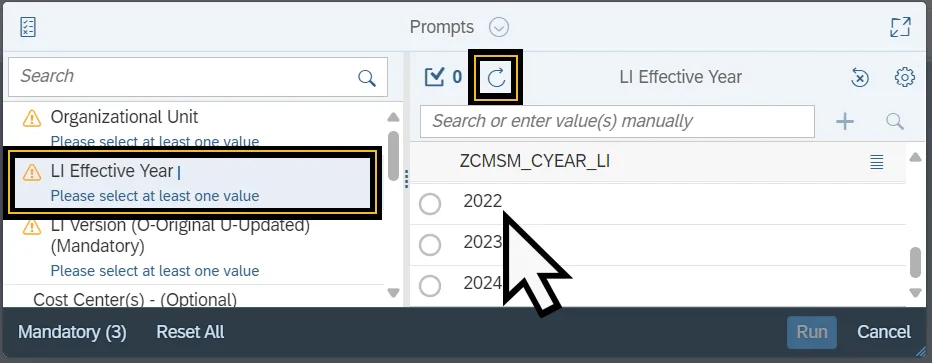 The LI Effective Year prompt selects the year where a legislative increase took effect and compiles the report from that data. Follow the steps below to complete the LI Effective Year prompt. There are 3 steps to complete this process.