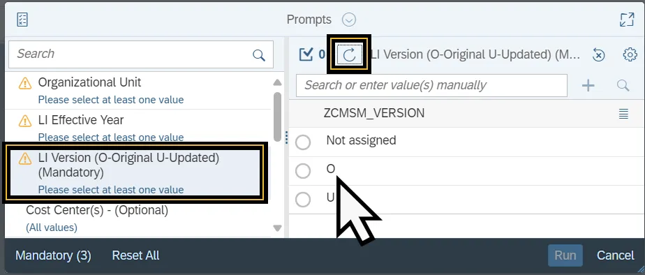 The LI Version (O-Original U-Updated) prompt selects if a LI Version is original or updated to compile the report data. Follow the steps below to complete the LI Version (O-Original U-Updated) prompt. There are 3 steps to complete this process.