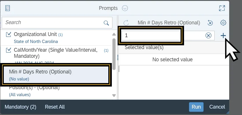 The Min# Days Retro prompt narrows the generated report to include only data that are equal to the minimum number of days retroactive. Follow the steps below to complete the Min# Days Retro prompt. There are 4 steps to complete this process.