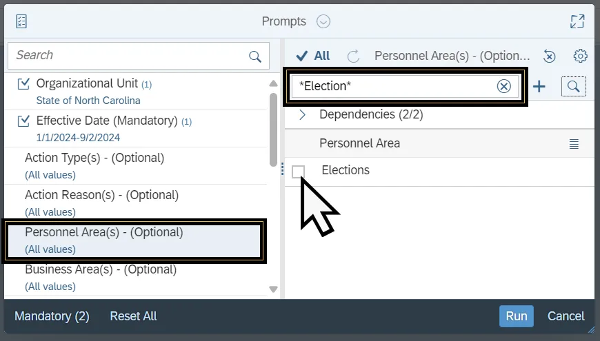 The Personnel Area(s) prompt selects personnel areas to compile the report. Follow the steps below to complete the Personnel Area(s) prompt. There are 4 steps to complete this process.