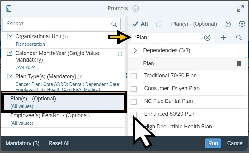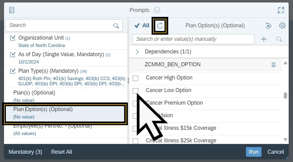 The Plan Option(s) prompt selects the specific options within a benefit plan and generates the report data based on those values. Follow the steps below to complete the Plan Options(s) prompt. There are 3 steps to complete this process.