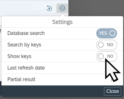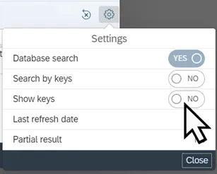 Every prompt value has an additional alphanumerical value assigned to the text value name. These keys make every value unique. Some examples of the alphanumerical keys are the personnel number is the key for the employee’s name, the position number 6####### is the key for the position’s text name, the job number 3####### is the key for the Job’s text name, etc. These keys can be displayed, directly entered, or searched for within the prompt. By default, the keys are toggled off, to turn the keys on click the Settings icon. Then toggle on Search by keys, to search by the key value, or toggle on Show Keys to display the key value.