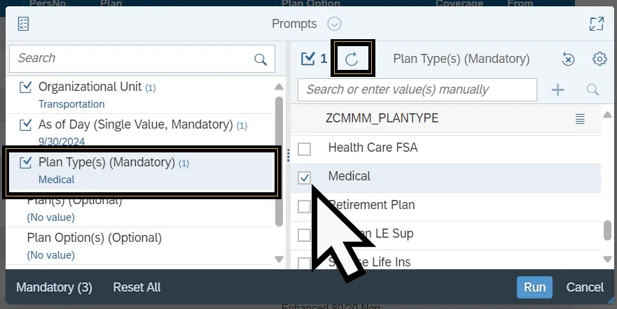 Step 2. Click the Refresh Values icon to see the list of specific options within a benefit plan. Alternatively, use the Search field to enter the specific option within a benefit plan, then select the Search icon.