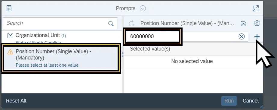 The Position Number (Single Value) prompt narrows the generated report to include only the position listed in the selected values. Follow the steps below to complete the Position Number prompt. There are 4 steps to complete this process.