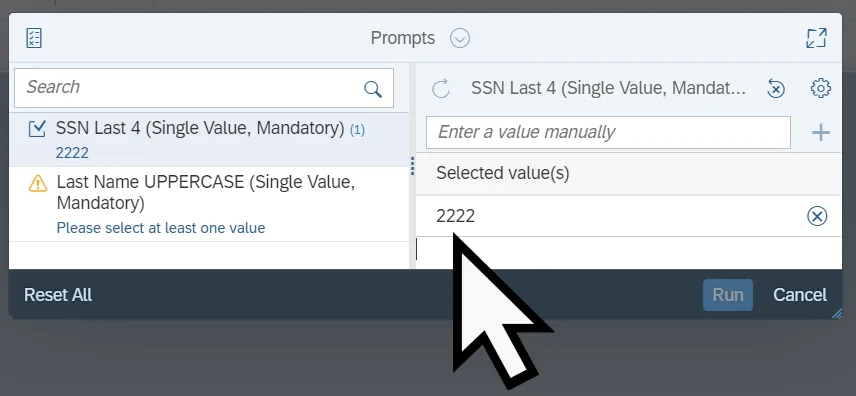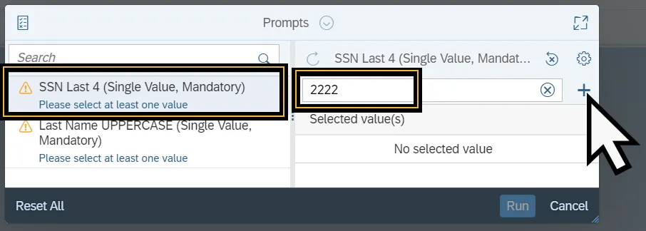 Step 1. Select the SSN Last 4 (Single Value) Prompt.