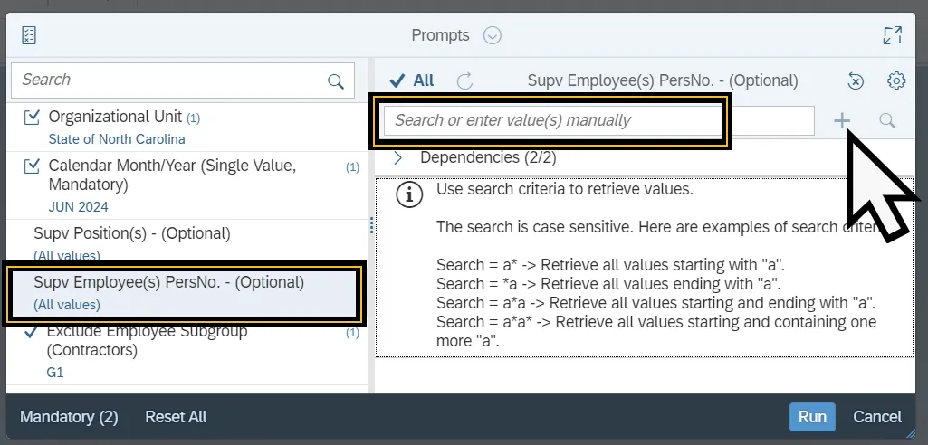 Step 1. Select the Supv Employee(s) PersNo. Prompt.
