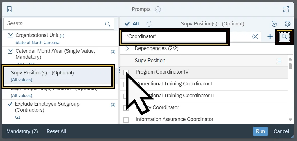 The Supv Position(s) prompt narrows the generated report to only include information that has the Supervisor listed in the selected values. Follow the steps below to complete the Supv Position(s) prompt. There are 4 steps to complete this process.