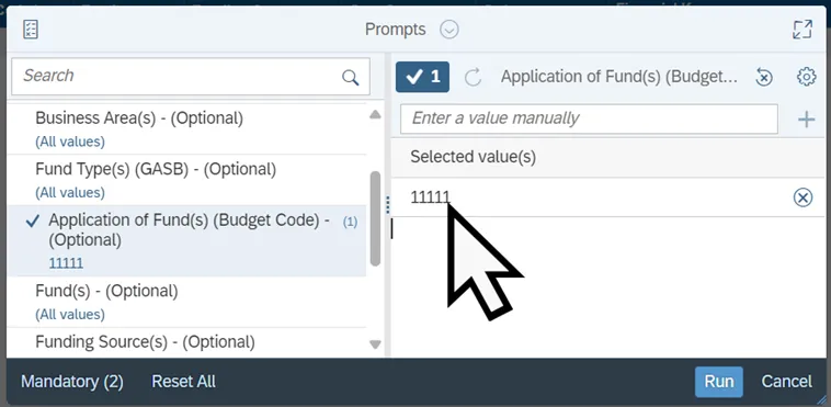 Step 1. Select the Application of Fund(s) (Budget Code) Prompt.
