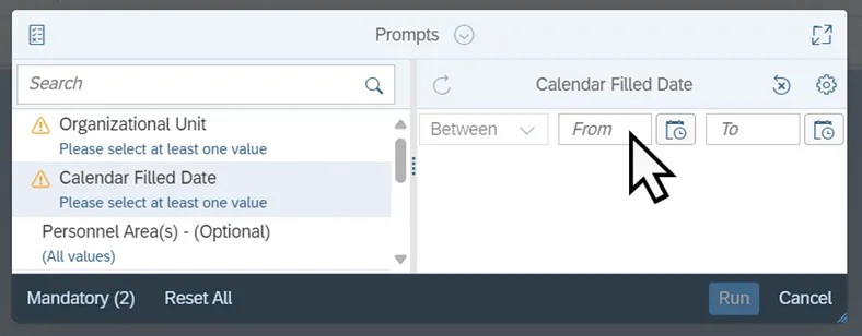 Note: Entering a Date Value in the Calendar Month/Year prompt can cause a query error message from the system, or the Run button will be disabled.