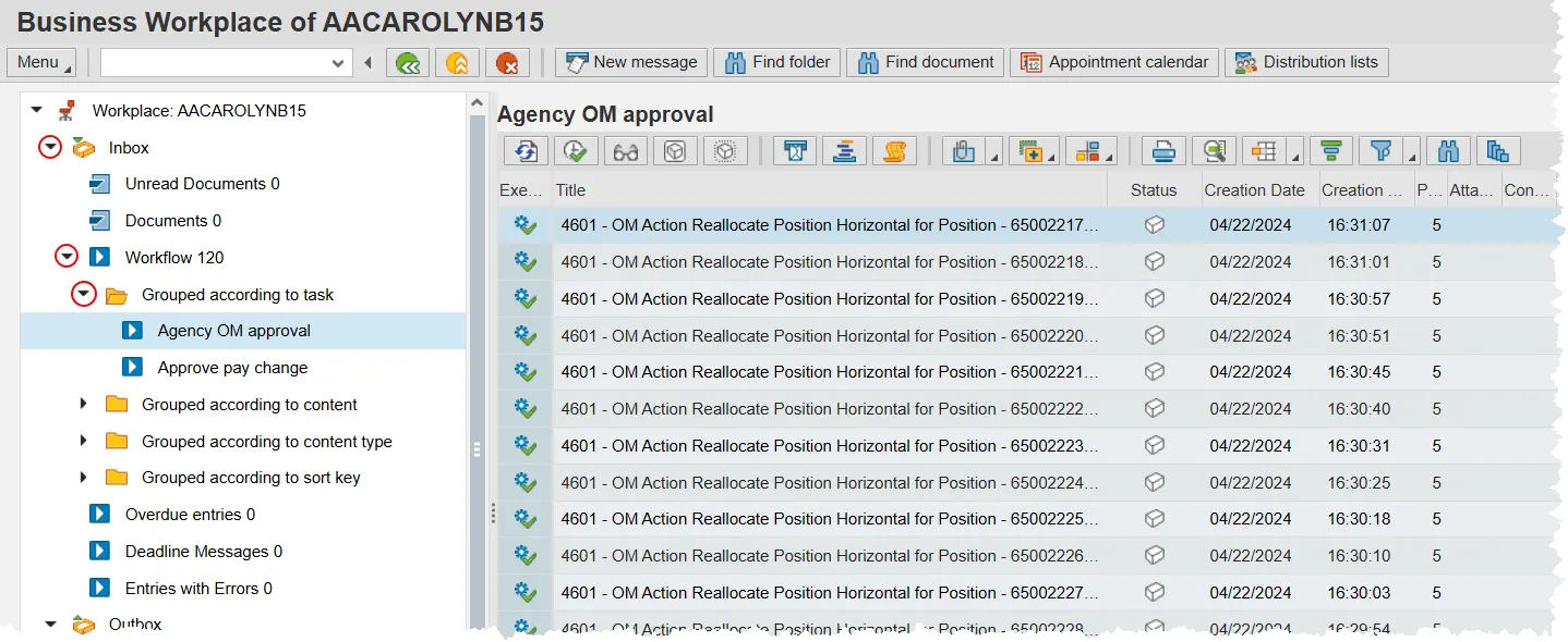 The Overview Tree will be found on the left-hand side when in your SAP Business Workplace. Options are available to group different work items together. Drill down by clicking on these nodes: Inbox → Workflow → Grouped according to task.