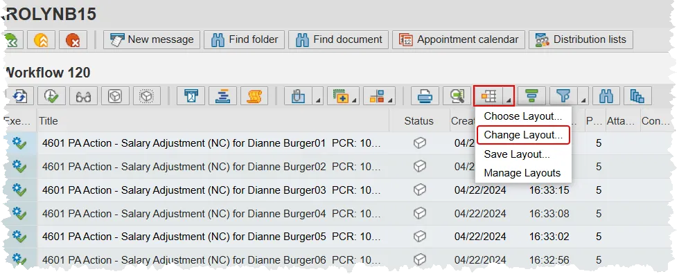 The view above is the default layout for the items in the Work List. This layout can be modified by removing columns or adding other preconfigured columns to your Work List view. To do so, click on the right hand side of the ‘Choose Layout’ button in the tool bar to display a drop down menu. Then choose ‘Change Layout’.