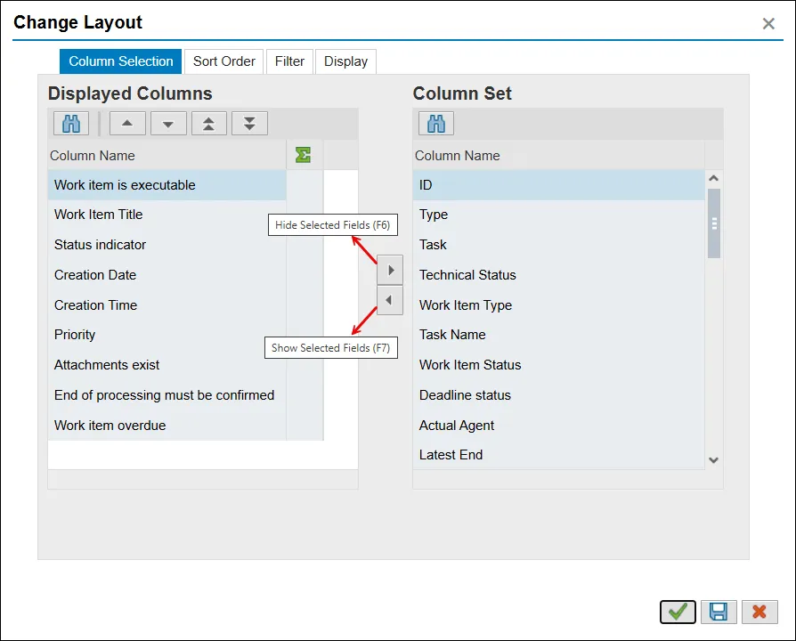 To remove currently displayed columns, click on them to highlight them and then click the Hide Selected Fields (F6) button in the middle of the two lists. To display a column listed in the column set, click on it and then click on the Show Selected Fields (F7).