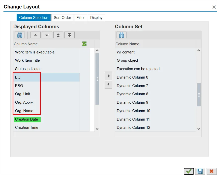 Review the example below. In the first image, the Creation Date line item is selected in the Displayed Columns set, and 5 items (EG, ESG, Org. Unit, Org. Abbrv., & Org Name) have been selected in the right hand list. The Show Selected Fields button is circled.