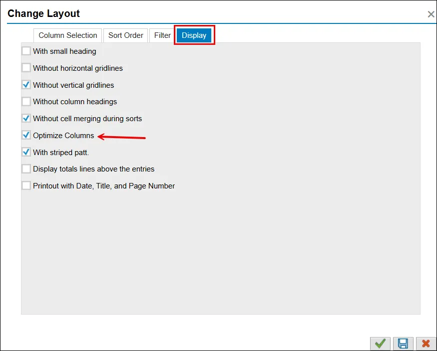 Next, locate and click on the Display tab in the Change Layout pop-up. If it is not already selected, check the box labeled Optimize Columns. This will automatically adjust the columns widths to the correct size.