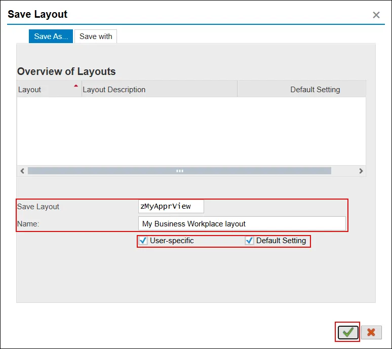 Enter a name and description for the Layout such as zMyApprView. The Layout must be saved starting with a Z so it will be specific to your Views. Make sure the check box User-specific is checked, and check Default setting so that whenever the Grouped Task is accessed, it will display the view that was created including the new columns. When the data entry above is complete, click the Green Check Continue (Enter) button.
