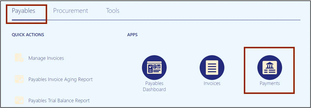 Step 2. On the Home page, click the Payables tab and click the Payments app.