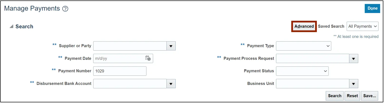Step 4. Payments can be viewed through a basic or advanced payments search. Click the Basic or Advanced button, as per the requirement.