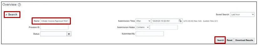 Step 10. Click the Search arrow and enter the search criteria. You can use several criteria like Name, Process ID or the Submission Time to inquire for the process status. The process name to search for is – Initiate Invoice Approval Workflow, click on Search button.