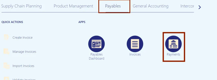 Step 2.    On the Home page, click the Payables tab and then click the Payments app.