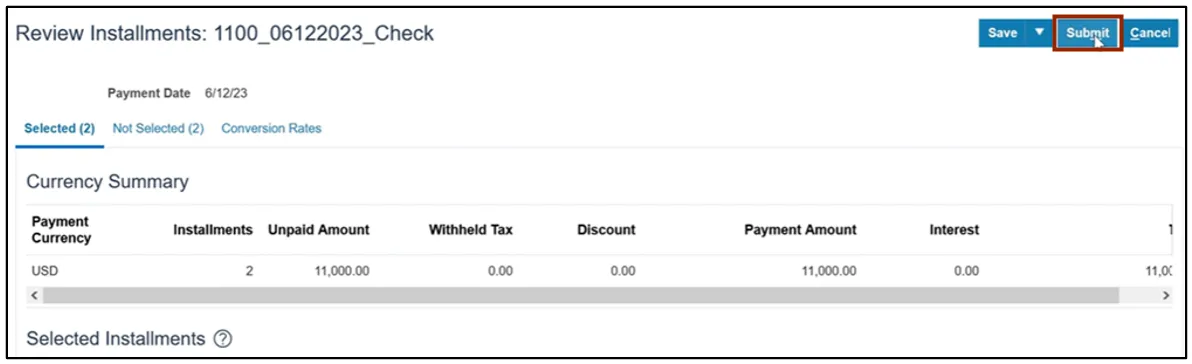 Step 4.    List of Installments will appear.  Select the Installments which need to be added and click the Add to Payment Process Request button. Make sure to select invoices which are only check payments.