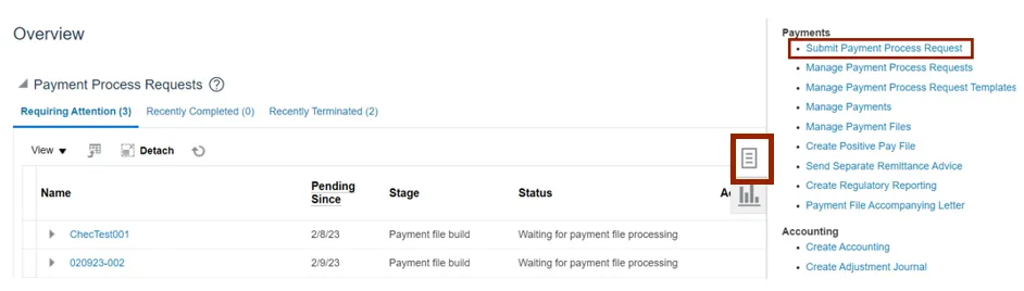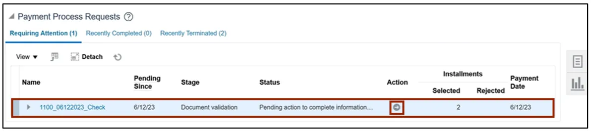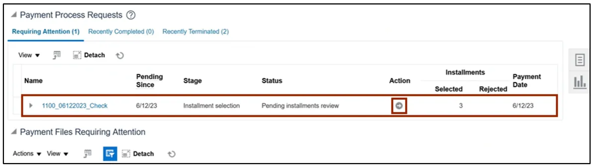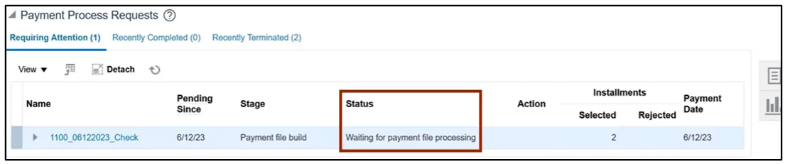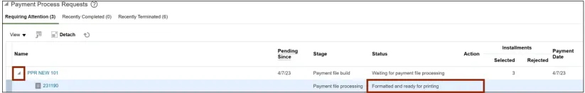 Step 5.    Once all the steps are completed, under the Requiring Attention tab, the status is available as Waiting for payment file processing for the selected PPR.