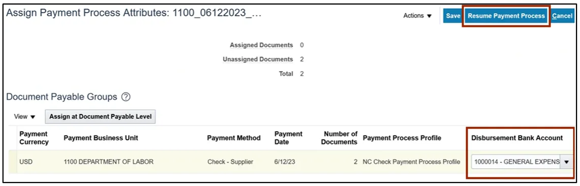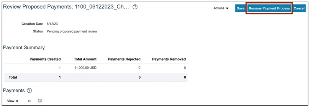 Step 2.    On the Review Proposed Payments page, click the Resume Payment Process button.
