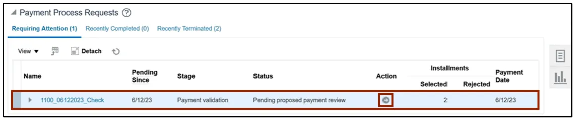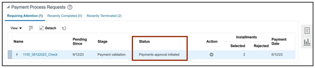 Step 4.    Under the Requiring Attention tab, the status is available as Payments approval initiated for the selected PPR.