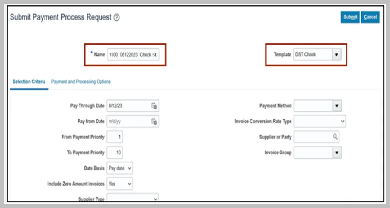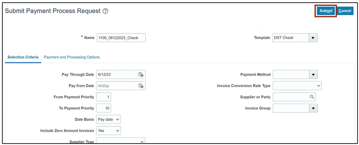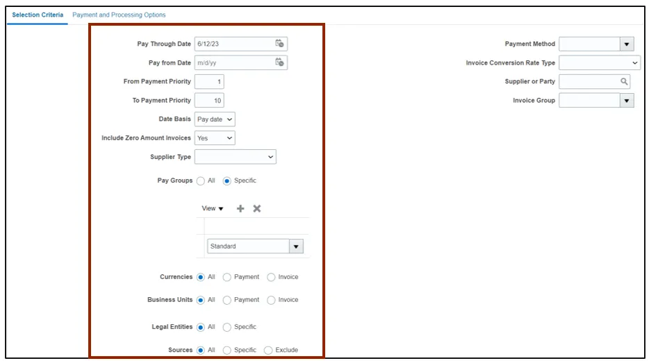 Step 5.    On the Selection Criteria tab, the details are auto-populated based on the template selected. Review the details and modify if required. Pay Through Date will determine the invoices picked in your PPR based on the invoice due date.